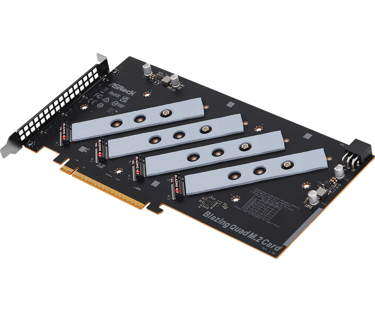 Using a PCIe 5.0 x16 interface to connect to a motherboard, the ASRock Blazing Quad M.2 card features four PCIe 5.0 (x4) M.2 slots (2242/2260/2280/2580/22110/25110), each with a maximum bandwidth of 16GB/s (128Gb/s). To fit four SSDs, ASRock designed the slots rotated 45º to the right. To indicate which slots are occupied, there's an M.2 SSD status indicator for each slot on the side of the holding bracket.