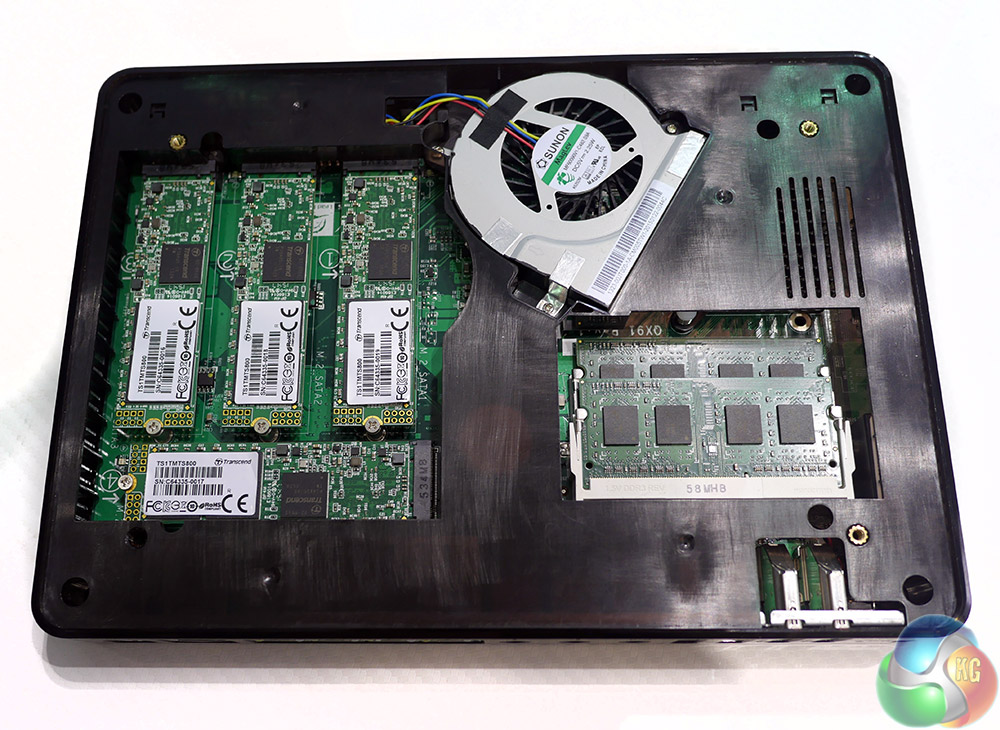 The big selling point of the system though, is what you can put inside it. Popping open the lid, we can see the four M.2 solid state drives plugged into their respective slots on the left hand side. This allows this NAS to be very thin and low profile. While you would want to provide some ventilation to allow the fan to cool the interior of the NASbook, it seems like it could easily fit in with your other hardware without much of a footprint.