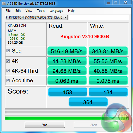 AS SSD only deals with incompressible data and we can see that this drive suffers dramatically. This is actually one of the worst results we have seen in recent years due to very weak 4k performance – dropping the overall score to 364 points. The Sandforce 3 powered AMD R7 SSD which we reviewed earlier this week scored almost 1,200 points, by comparison.