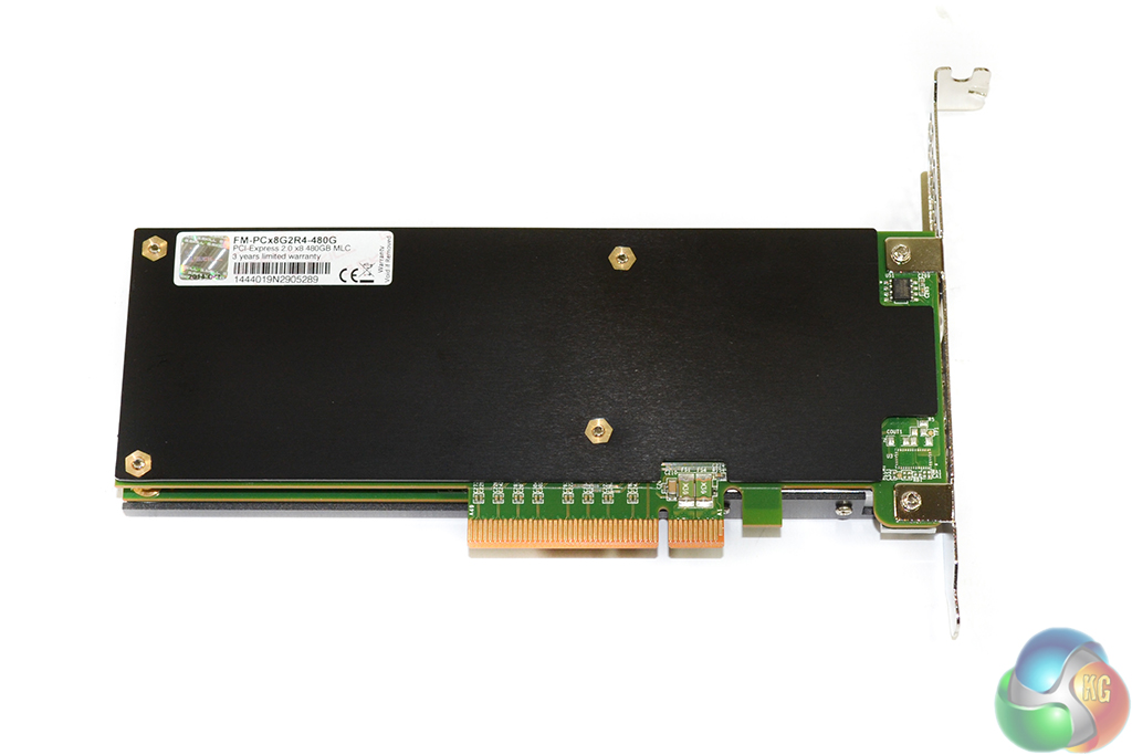 The PCIe 2.0 x8 connector is clearly visible. To get the best performance out of the drive, you will want to install it in a PCIe 2.0 (or 3.0) slot with at least eight lanes being fed. On Intel 7-, 8- or 9-series boards, for example, this may negate the functionality of SLI for graphics cards, due to the processor's sixteen lane limitation.