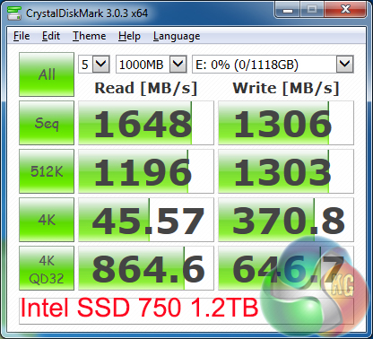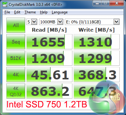 Intel's SSD 750 drive makes a positive start in the CrystalDiskMark test. Sequential read and write numbers are highly impressive, as are those for 512KB transfers.
