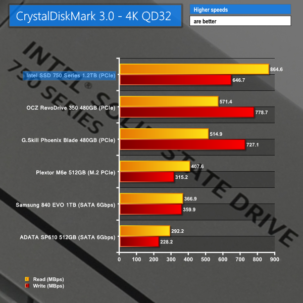 The PCIe-fed, NVMe-compatible SSD 750 is typically outperforming (in 4K workloads) four-drive RAID 0 solutions such as G.Skill's Phoenix Blade and the OCZ RevoDrive 350.