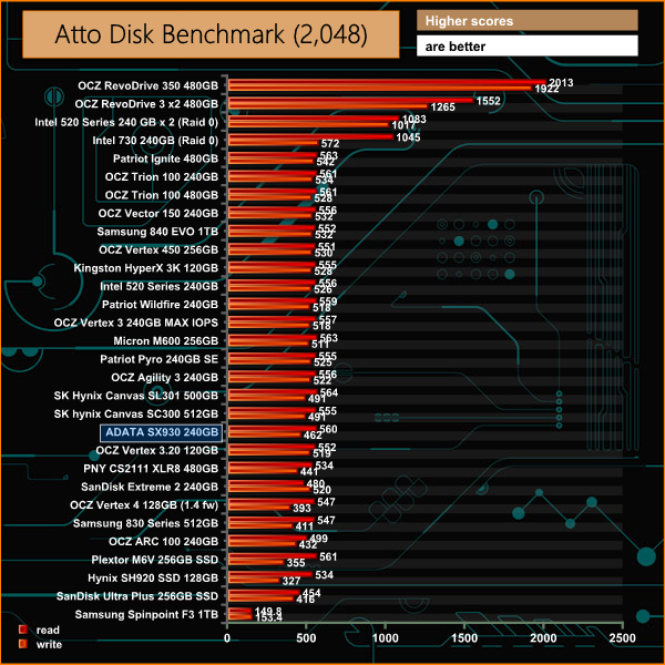 Our ATTO results show that the ADATA SX930 offers impressive speeds, with read performance hitting 560 MB/s. The drive delivers strong write speeds too, hitting the 462 MB/s mark.