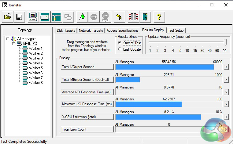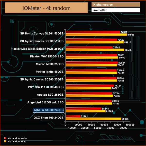 IOMETER shows us the 4kb random read and write performance. This drive just misses its performance targets of 70k for both, with 55k on the write and 61k on the read.