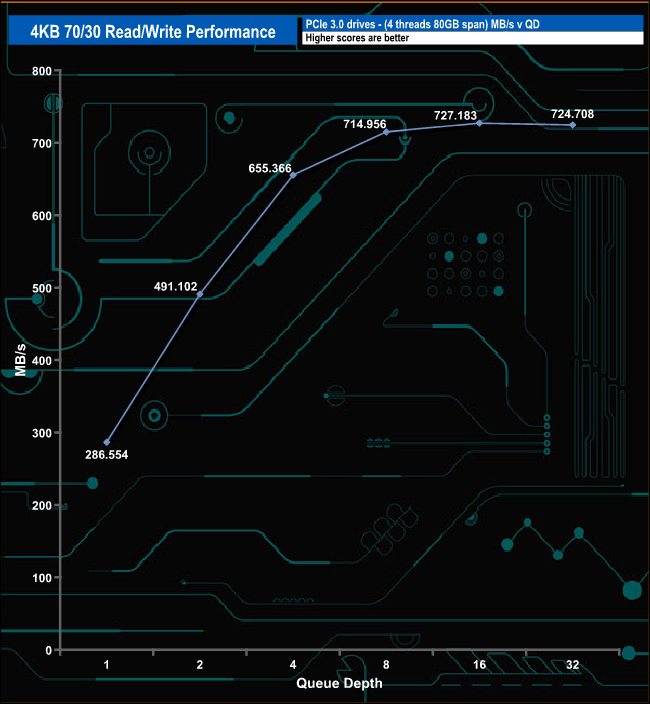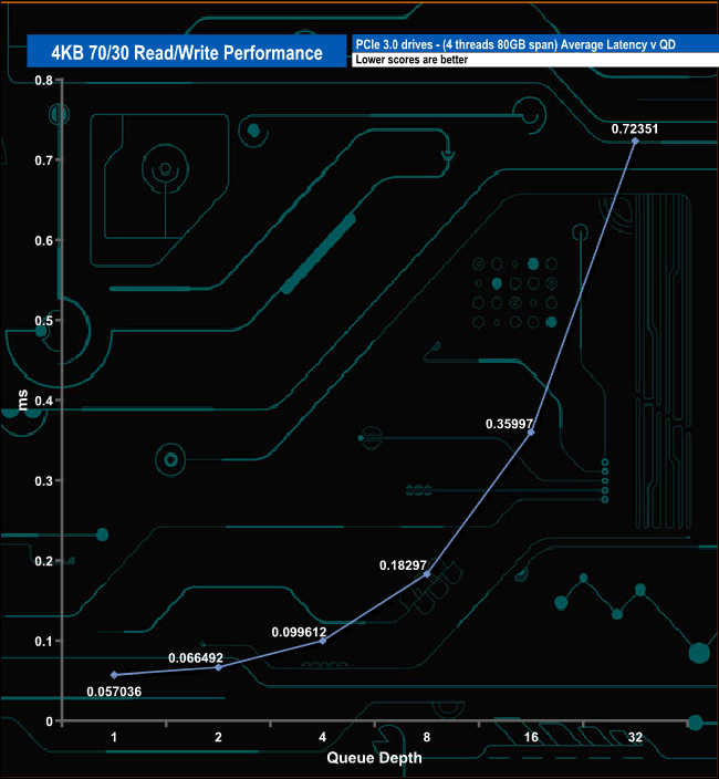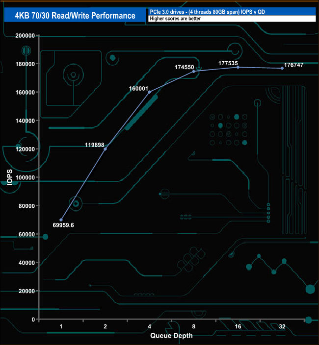 The 1TB Acer FA100 handles the 4K 70/30 read/write mixed test pretty well. The drives performance peaks at QD16 at 177,535 IOPS (727.18MB/s) before dropping back to finish the test run (QD32) at 176,747 IOPS (724.70MB/s).