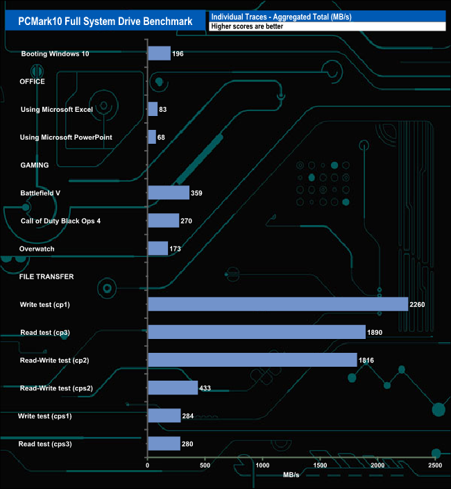 The PCMark 10 Full System Drive Benchmark uses a wide-ranging set of real-world traces from popular applications and common tasks to fully test the performance of the fastest modern drives. The benchmark is designed to measure the performance of fast system drives using the SATA bus at the low end and devices connected via PCI Express at the high end.