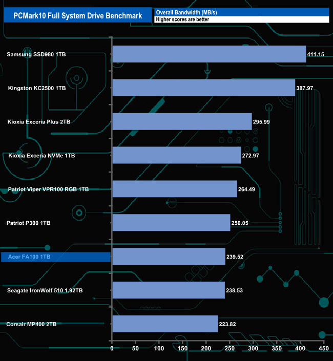 Overall the 1TB Acer FA100 seems to struggle a wee bit with the PCMark 10 Full System Drive Benchmark with a bandwidth result of 239.52MB/s, which puts it in the bottom half of the results chart.