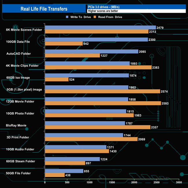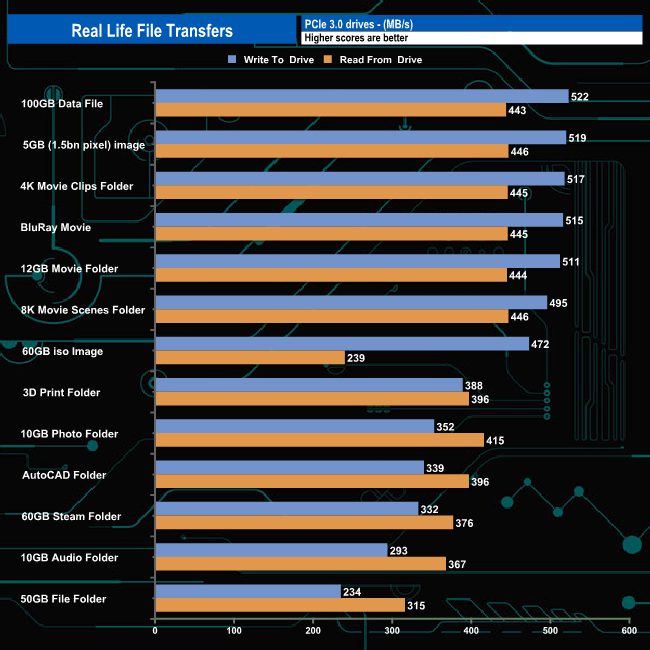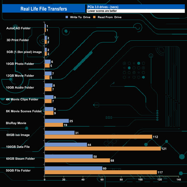 Switching over to all NVMe storage testing saw some impressive jumps in performance. Three of the write transfers and six of the read were over 2GB/s. Once again the read performance when the drive was working on the 60GB iso image was slower than we expected and on this occasion, it was joined by the read performance when dealing with the 100GB data file.