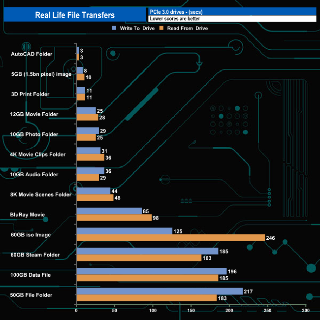 To test the real-life performance of a drive we use a mix of folder/file types and by using the FastCopy utility (which gives a time as well as MB/s result) we record the performance of drive reading from & writing to a 256GB Samsung SSD850 PRO.