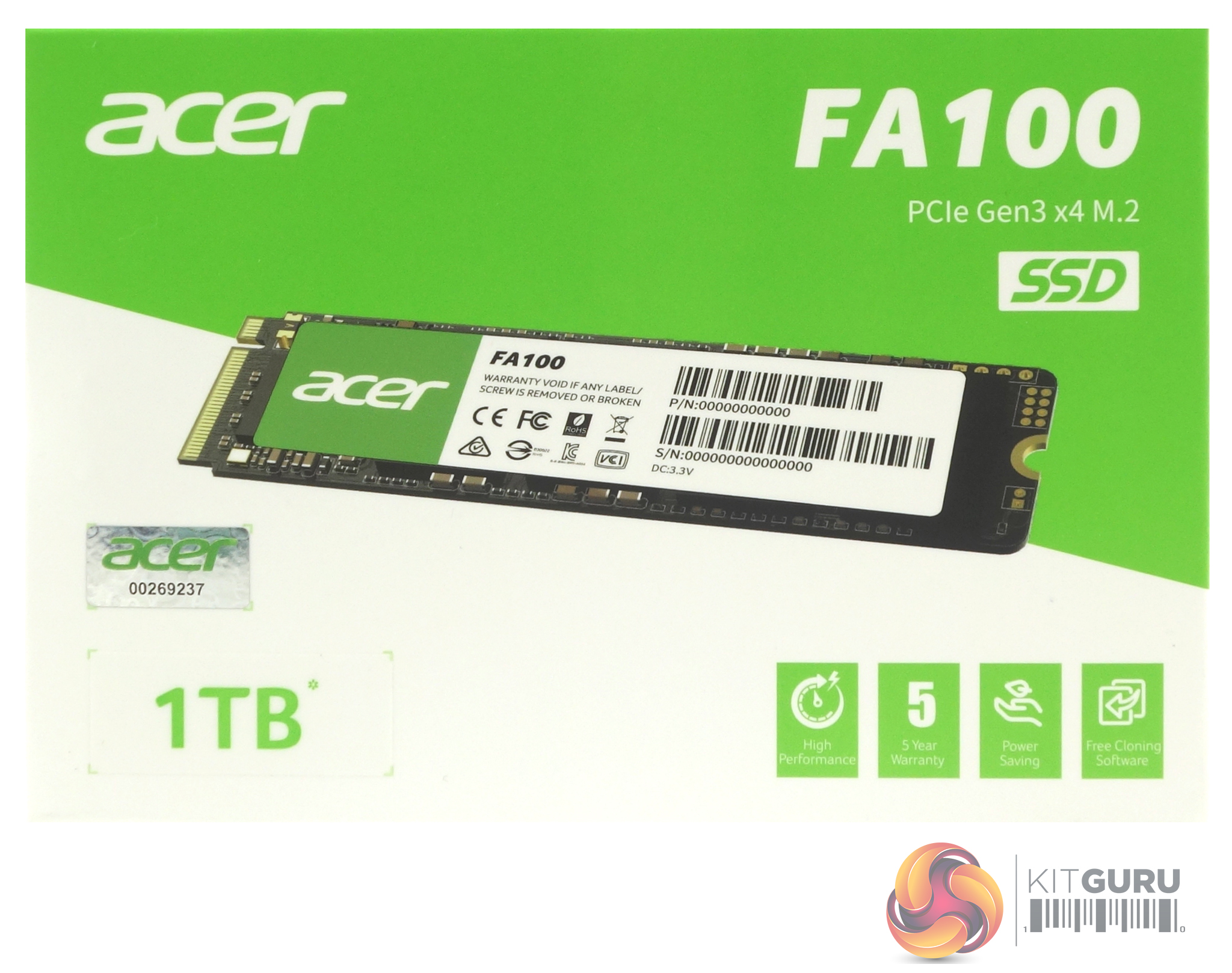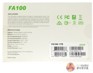 The FA100 drive comes in a compact box with an image of the drive on the front below which is a sticker carrying the drive's capacity. To the right of the sticker are four icons representing high performance, the fact that the drive comes with a 5-year warranty, that it's power-saving and it comes with free cloning software (by downloading Acronis True Image OEM from the Acer website). The rear of the box has a small list of the drive specifications.