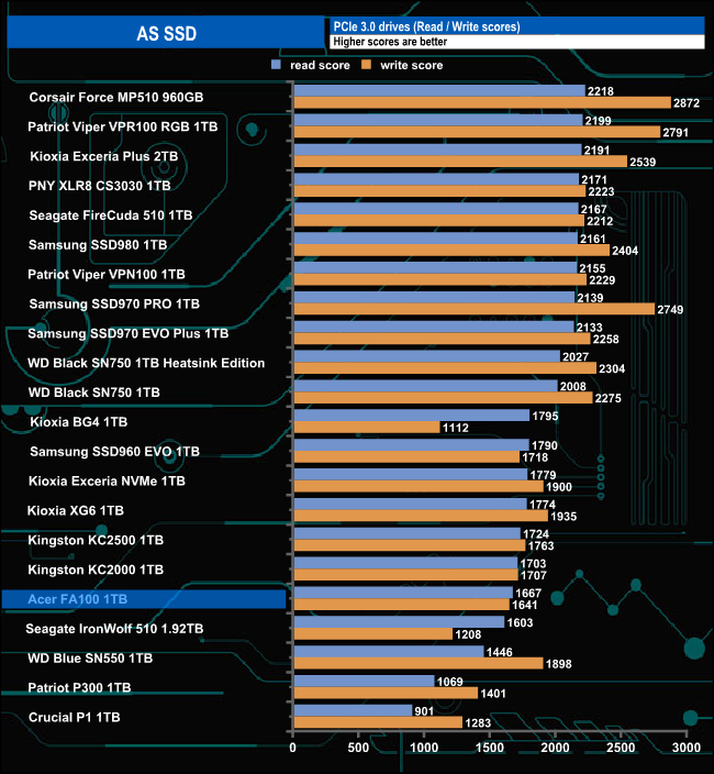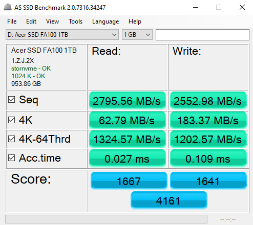The FA100 struggled in the more demanding AS SSD benchmark. With a read score of 1667 and 1641 for writes it sits in the bottom half of the results chart.