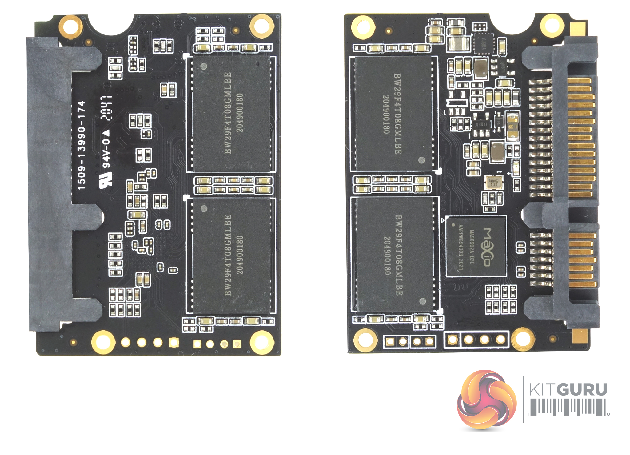 One side of the PCB holds two NAND packages (coded BW29F4T08GMLBE) while the other side of the PCB holds the Maxio MAS0902A-B2C controller and another two NAND packages.