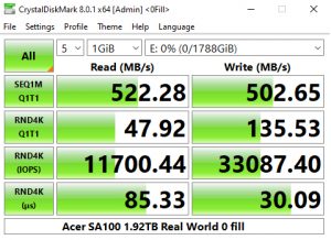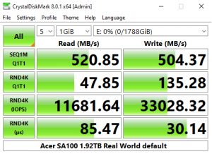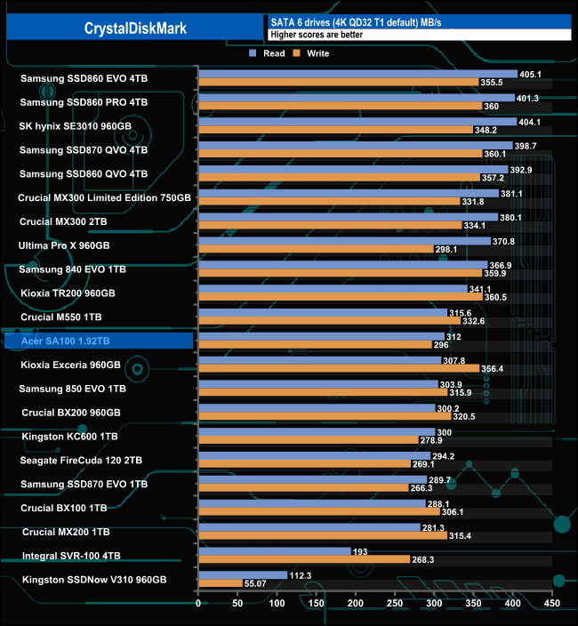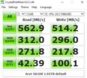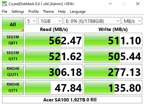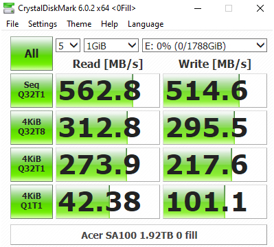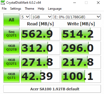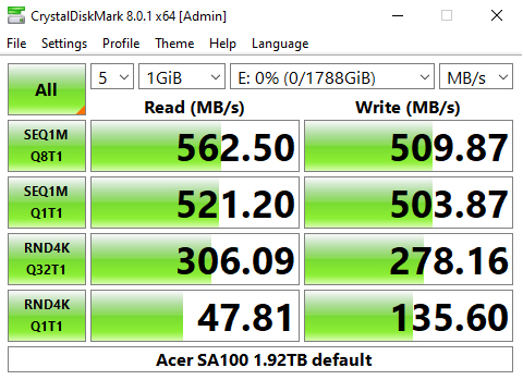 In the CrystalDiskMark QD32 single-threaded benchmark test runs, the scores of 312MB/s and 296MB/s for reads and writes respectively put the Acer SA100 into mid-position in the results table. We could confirm the official Sequential 560MB/s read performance with a tested score of 562MBs and also the official write figure of 508MB/s with the best test result of 514MB/s.