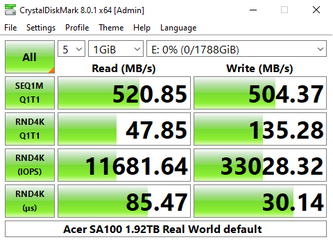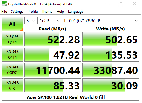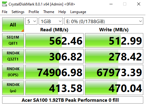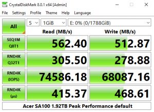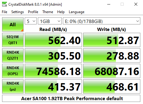Acer quotes 4K random performance for the 1.92TB drive as up to 76,000 IOPS for reads and up to 77,000 IOPS for writes. Testing the drive with the Peak Performance profile, the best read figure produced by the drive was 74,906 IOPS with writes at 68,087 IOPS, both short of the official figures.