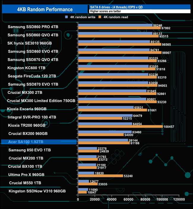 The Acer SA100 is rated as up to 76,000 IOPS for reads and up to 77,000 IOPS for writes. Unfortunately, we couldn't get close to those figures with our tests. The best read figure we saw was 59,144 IOPS while the best write figure of 61,186 IOPS was a little nearer to the official figure.