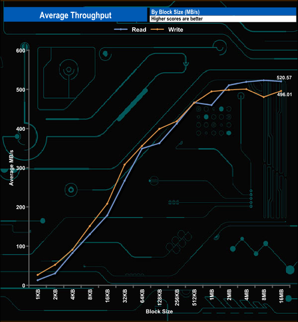 In our throughput test, the read performance peaked at the 8MB block mark at 523.30MB/s before falling back slightly to finish the test run at 520.57MB/s. The peak read figure is a little shy of the official maximum read figure of 560MB/s. Write performance peaked at the 4MB block at 500.67MB/s, closer to the official maximum write figure of 508MB/s. The write performance fell back slightly to finish the test run at 496.01MB/s.