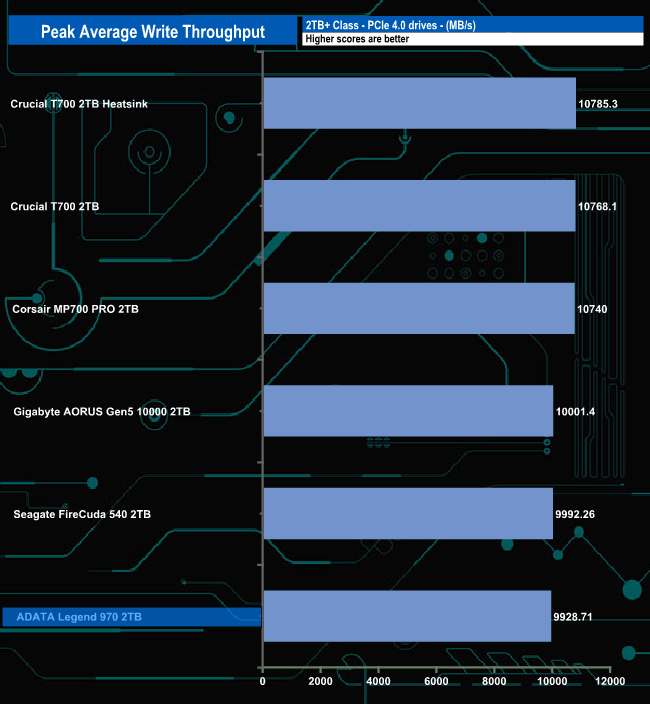 As with the read throughput test result, the peak write result of 9,928.71MB is short of the official maximum of 10,000MB/s but at least it is a lot closer to the official figure than the read result.