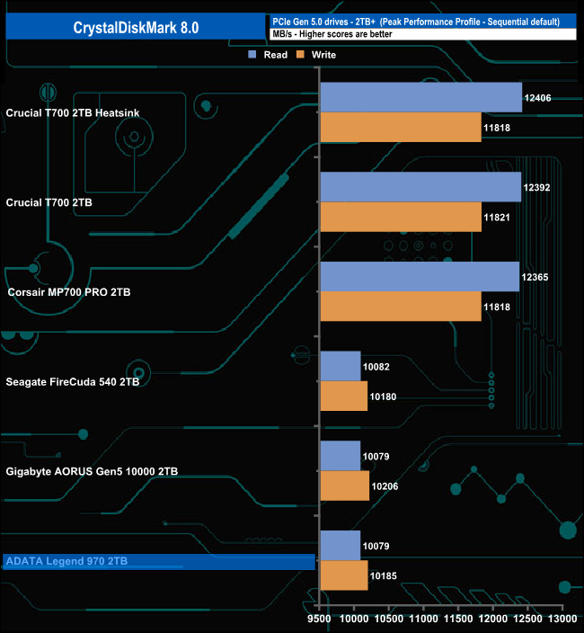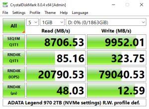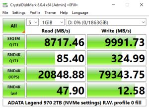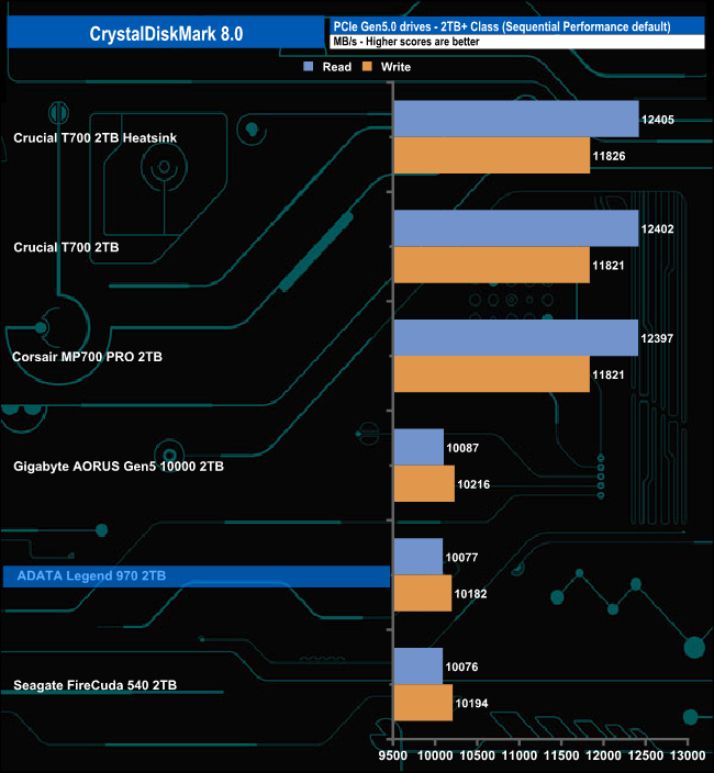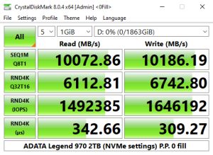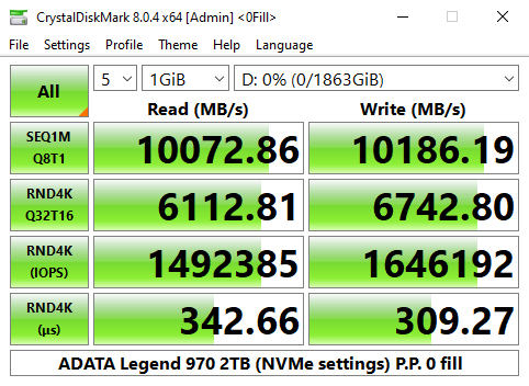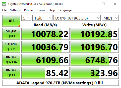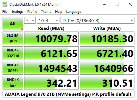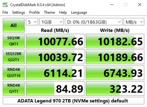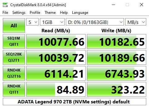 As you can see from the benchmark result screens we can confirm the official Sequential read/write figures for the 2TB Legend 970 of up to 10,000MB/s with read/write test results of 10,077MB/s and 10,182MB/s respectively.