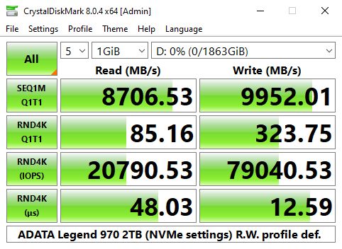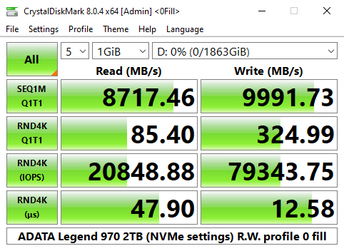 In CrystalDiskMark 8's 4K QD1 T1 test, the ADATA Legend 970 2TB sits at the bottom of the table with a read result of 84.39MB/s backed up with a write score of 323.22MB/s. Although the drive sits at the bottom of the Gen 5 drives we've tested to date, in reality, we are only talking 2.49MB/s difference in read performance between the Legend 970 and the Crucial T700 drive that tops the table.