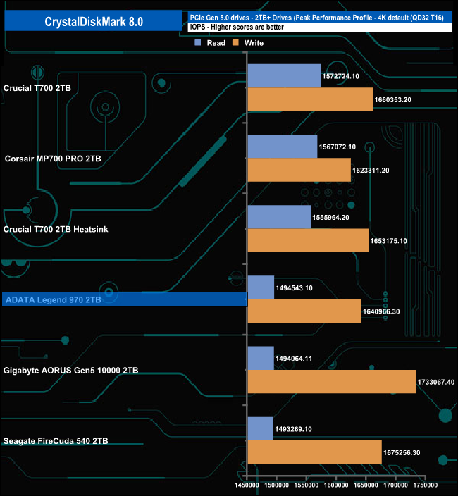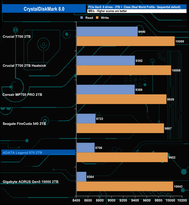 ADATA's Legend 970 sits between the Seagate Firecuda 540 and the Gigabyte AORUS Gen 5 10000 in the Real World Profile performance chart. It has a faster read score than the Gigabyte drive but its write performance is slower than both it and the Seagate drive.