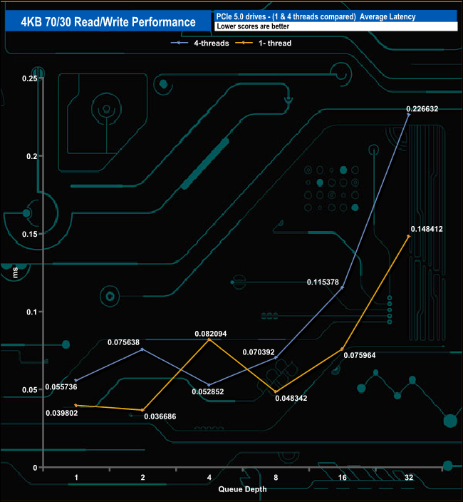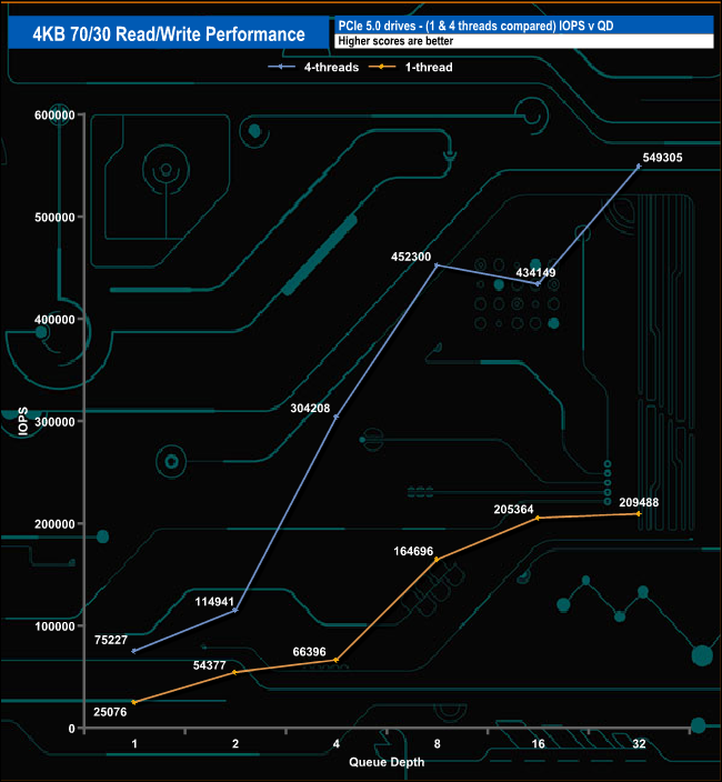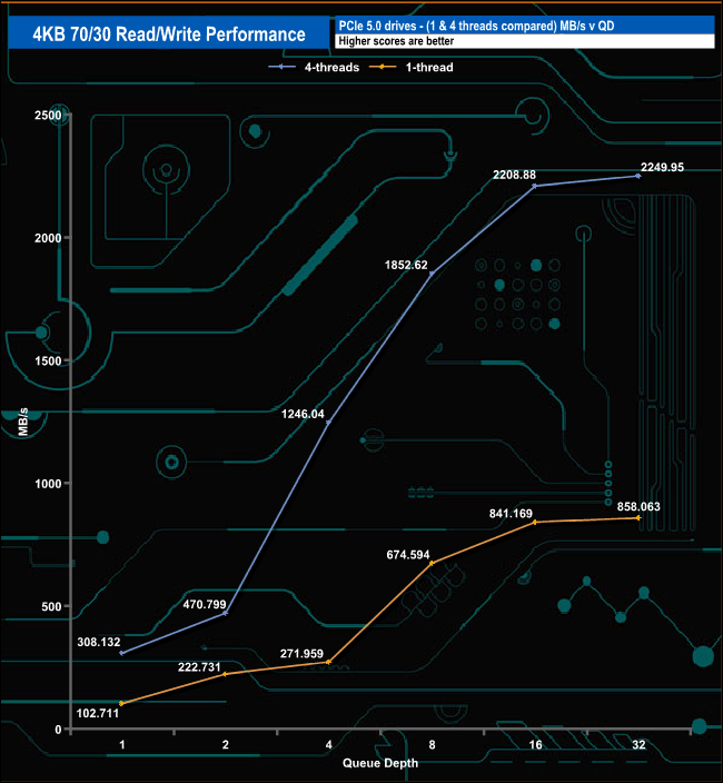 We used CrystalDiskMark 8’s custom settings to test the 4K 70/30 mixed read/write performance of the drive through a range of queue depths using a single thread and four threads.