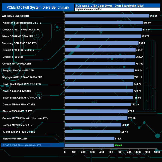 Looking at the overall bandwidth figure of 530.44MB/s, it appears that ADATA's XPG Mars 980 Blade drive doesn't handle the rigours of the PCMark 10 benchmark that well.