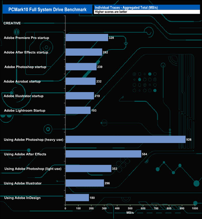 Using PCMark10's Full System Drive Benchmark, the six Adobe startup traces produced an average of 249MB/s, with the fastest being the Adobe Premiere Pro startup trace at 328MB/s, the slowest, the Lightroom startup at 193MB/s. For the five usage traces, the drive averaged 467.8MB/s. The fastest test was, as usual, the Photoshop heavy usage trace at 926MB/s, the slowest, the InDesign test at 180MB/s.