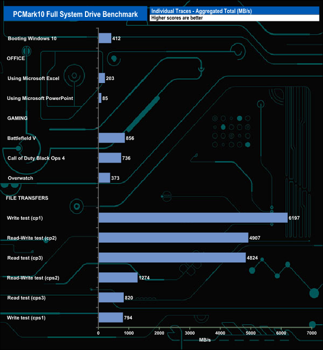 The three gaming traces produced an average result of 655MB/s, the fastest being Battlefield V at 856MB/s. Then came Call Of Duty Black Ops 4 at 736MB/s and finally Overwatch at 373MB/s. When it came to the six file transfers, the drive averaged 3,136MB/s with the fastest being the cp1 Write test at 6,197MB/s.