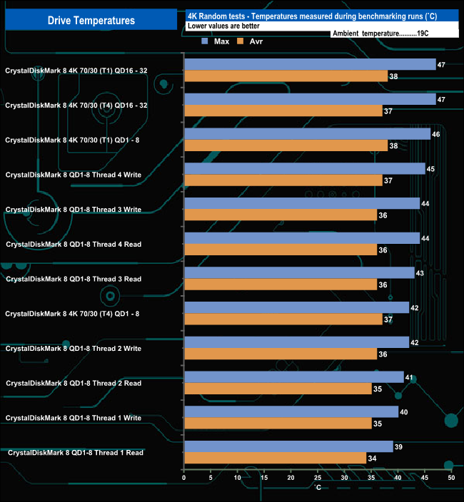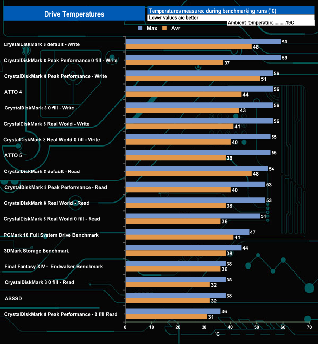 We took note of the drive’s temperature during some of our benchmarking runs. The ADATA XPG Mars 980 Blade 2TB comes with an optional stick-on heatsink. Unlike the previous generation Legend 970, which uses active cooling, the advances in controller and NAND technologies make this unnecessary, hence the thin optional heatsink. The hottest the Mars 980 Blade got during the benchmark runs was 59°C during CrystalDiskMark 8 default Write and Peak Performance 0 fill Write tests. It averaged 51°C for the bulk of our testing and 45°C for the 4K-based tests.