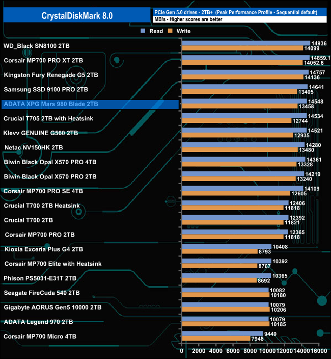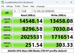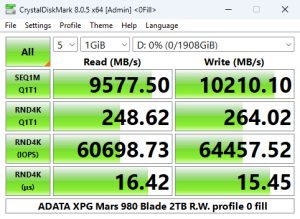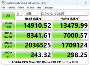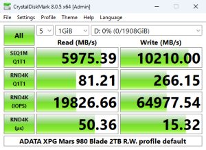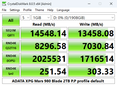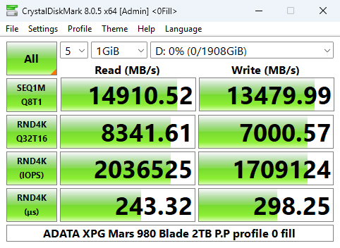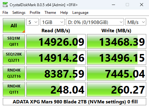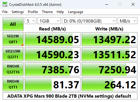 As you can see from the benchmark result screens, we can confirm the official Sequential read/write figures for the 2TB XPG Mars 980 Blade and better them a little. At 14,589MB/s, the read result is a 589MB/s improvement over the official figure, while the write result of 13,497MB/s shows a 497MB/s bettering over the official figure.