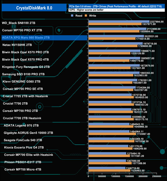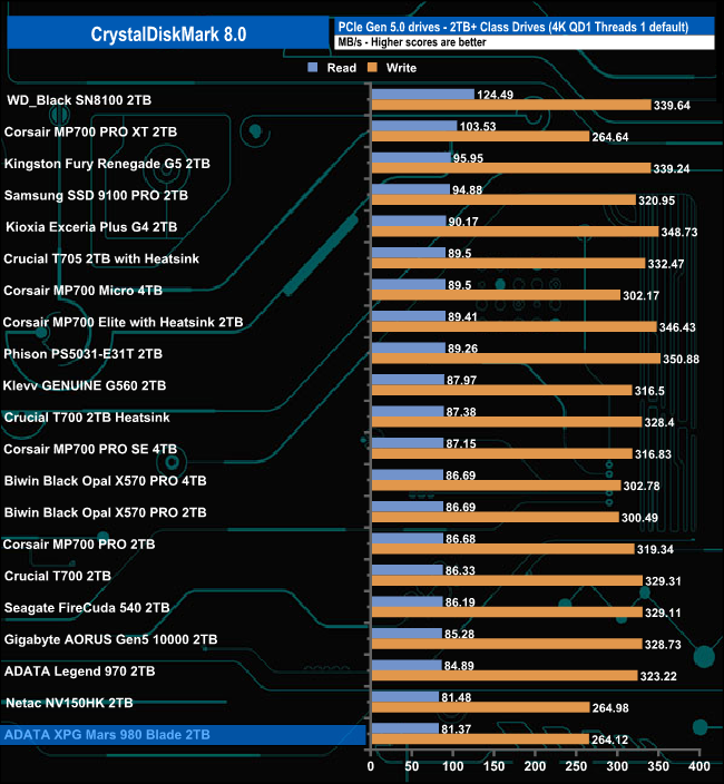 In CrystalDiskMark 8's 4K QD1 T1 test, the ADATA XPG Mars 980 Blade 2TB sits at the bottom of the table with a read result of 81.37MB/s backed up with a write score of 264.12MB/s, the read figure just short of the previous generation ADATA Legend 970 read performance. The write performance of the Mars 980, however, is a fair bit slower than the Legend 970.