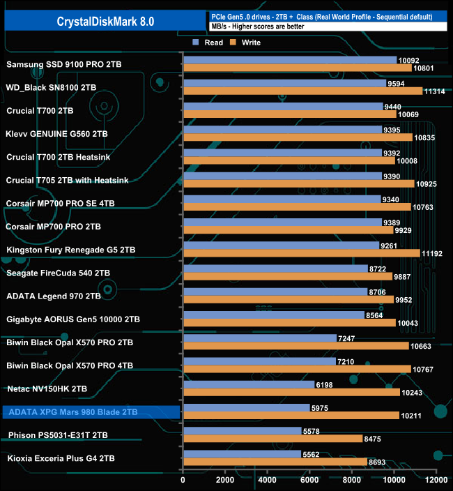 Using CrystalDiskMark 8's Real World Profile test, the read result of 5,975MB/s sees the drive in the bottom half of the table, 2,731MB/s behind the previous generation Legend 970. However, the latest drive has better write performance.