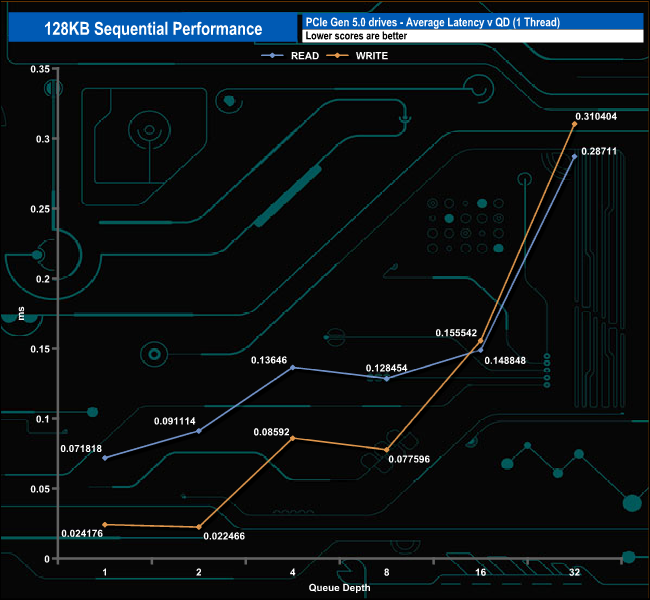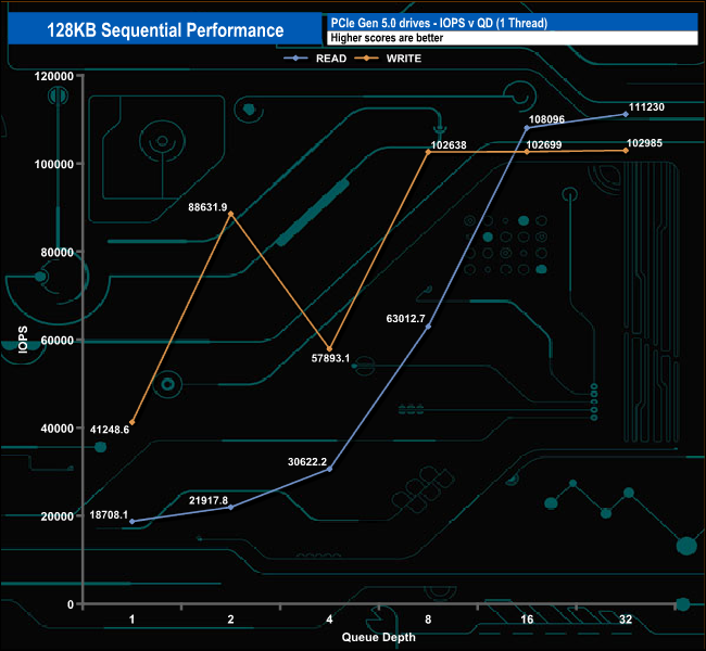 We used CrystalDiskMark 8‘s custom settings to test the Sequential read and write performance of the drive through a range of queue depths. The setup for the tests is listed below.