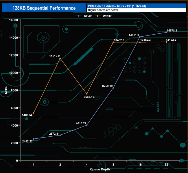 With this Sequential test, we could confirm the official Sequential read/write ratings for the drive of up to 14,000MB/s and up to 13,000MB/s, respectively, with a peak read result of 14,578MB/s with writes at 13,492MB/s.