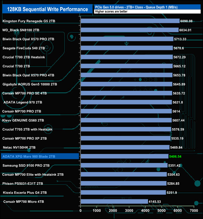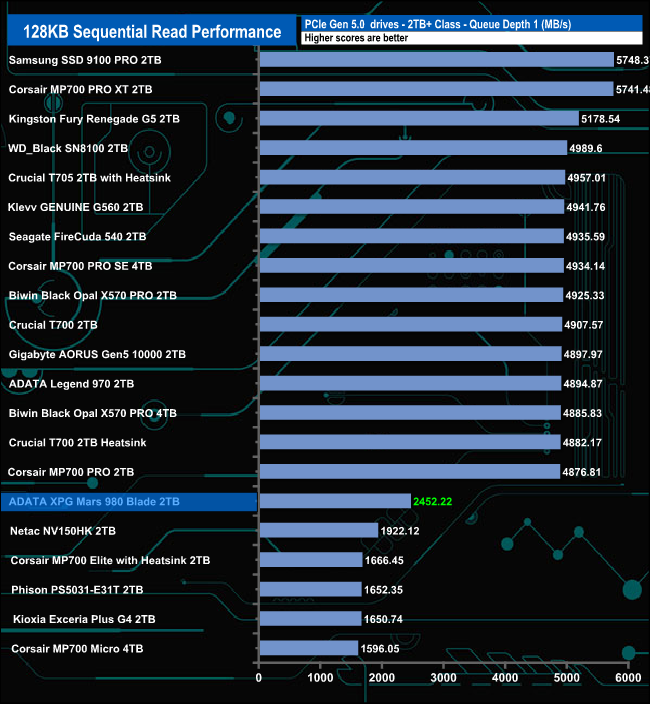 At QDs 1 & 4, the ADATA XPG Mars 980 Blade sits in the lower half of the results chart; at QD4, it sits in last place. However, at QDs 2 and 32, the drive sits in the top 5 of the charts.