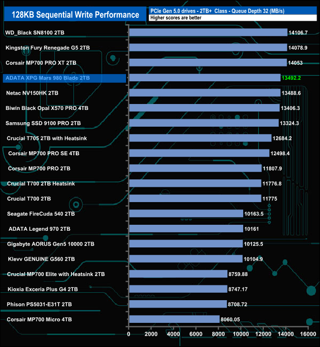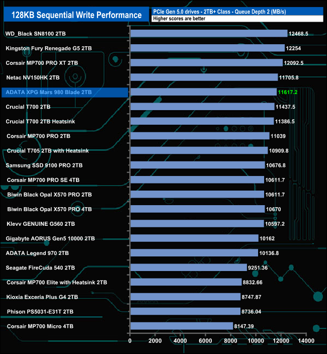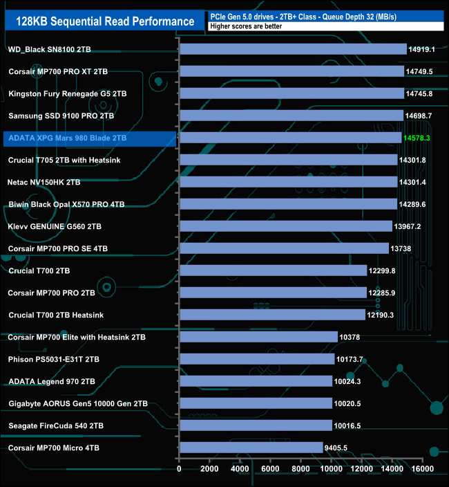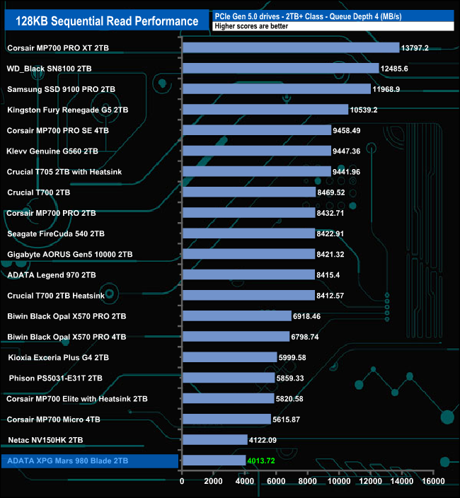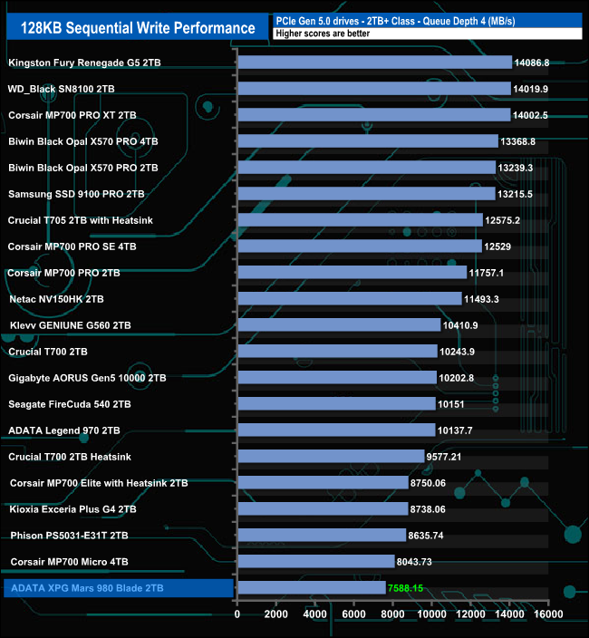 The best performance from the XPG Mars 980 Blade came at QD32; its score of 14,578.3MB/s puts it into fifth position in the results chart.