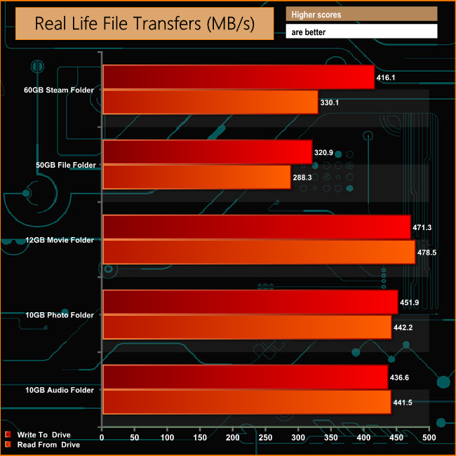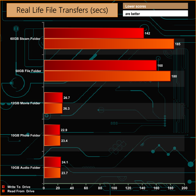 The SX950 dealt with the real life file transfers generally very well although the performance did drop back in both phases when dealing with the 50GB file folder and when reading back the contents of the 60GB Steam folder.