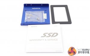 The drive is bundled with a spacer to use the drive in notebooks with 9mm drive bays, a 3.5in to 2.5in drive bay converter and a warranty booklet.