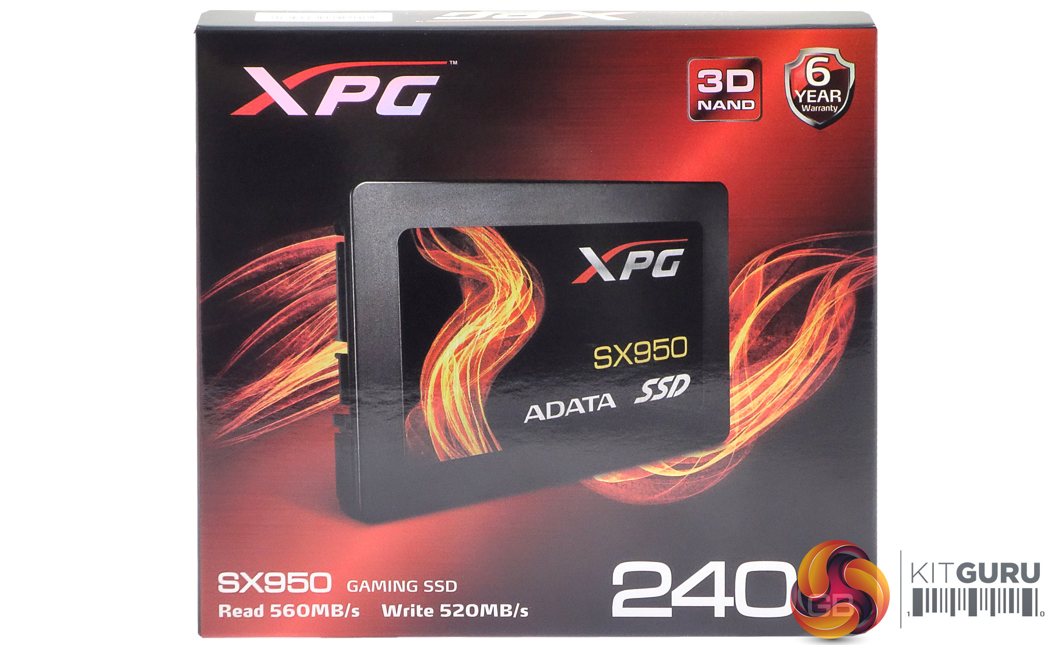 The ADATA XPG SX950 240GB drive comes in a compact box, the front of which has an image of the drive together with the model number, capacity, the fact it uses 3D NAND and sequential read/write performance figures together with neat flame coloured swoosh type graphic.