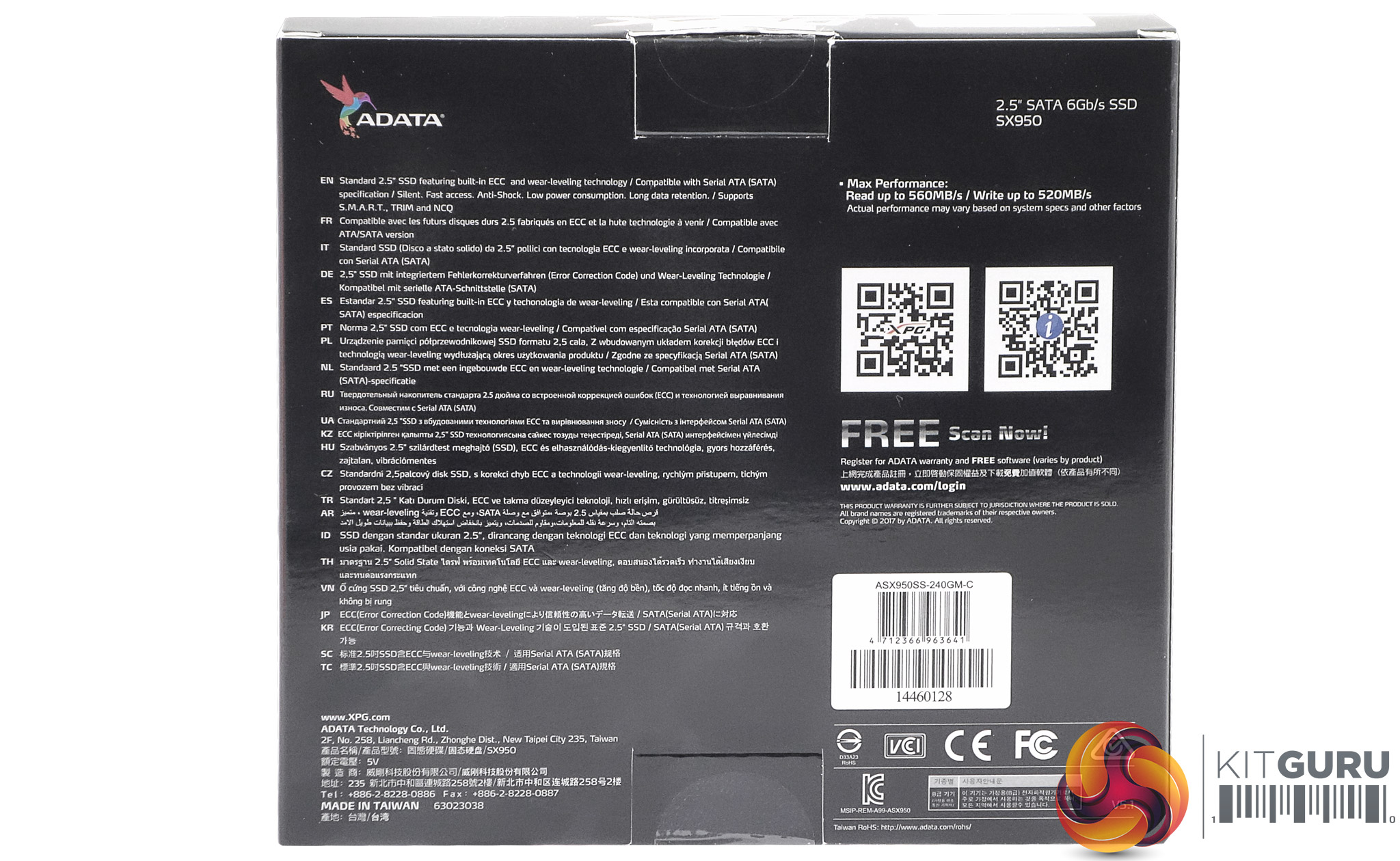 The rear of the box has some multilingual marketing details, the read/write performance figures again and a couple of QR codes that access the XPG website.