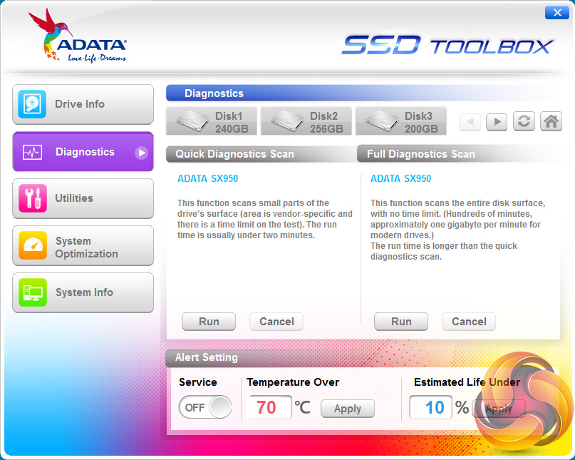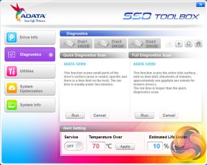 The diagnostics section allows you to perform either quick or full diagnostic scans of the drive and to set the alarms for when the drive gets too hot or gets close to its end of life.
