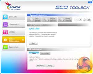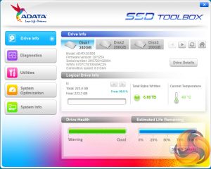 ADATA's management utility for their SSD's is called the SSD Toolbox and it certainly catches the eye as it's about the most colourful looking utility out there. The drive info page displays information about how much capacity is being used and the TBW number.