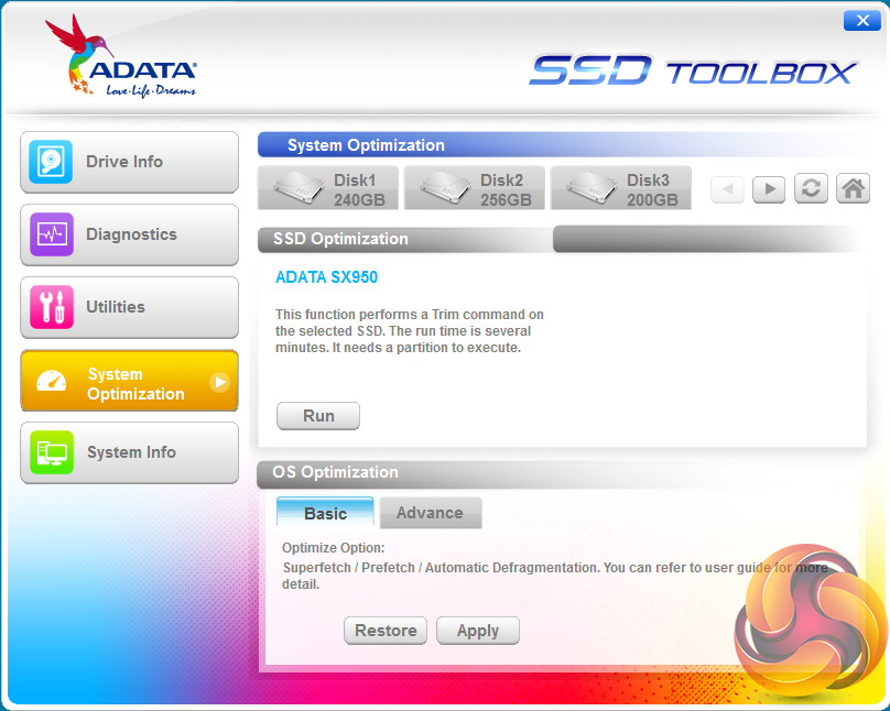 The system optimisation page allows for some OS settings to be changed using two settings Basic or Advanced. Basic options include changing Superfetch, Prefetch, and Automatic Defrag settings.