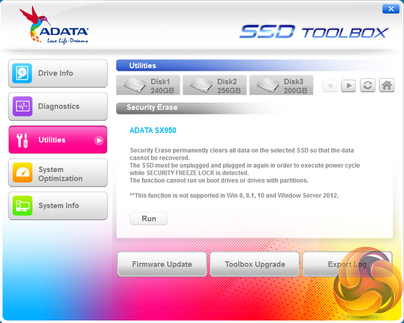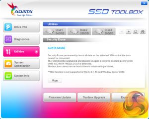 The utilities page is home to the secure erase function and it's also the page where you can update the firmware and the toolbox software and export any logs you have created.