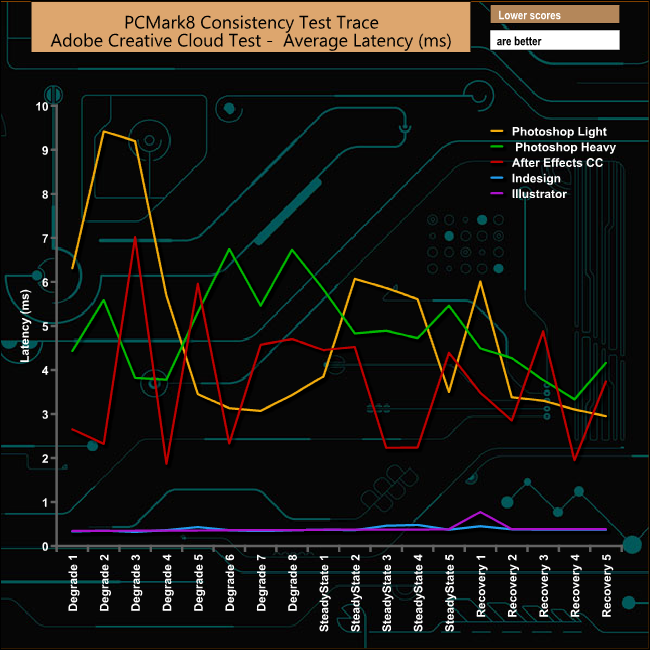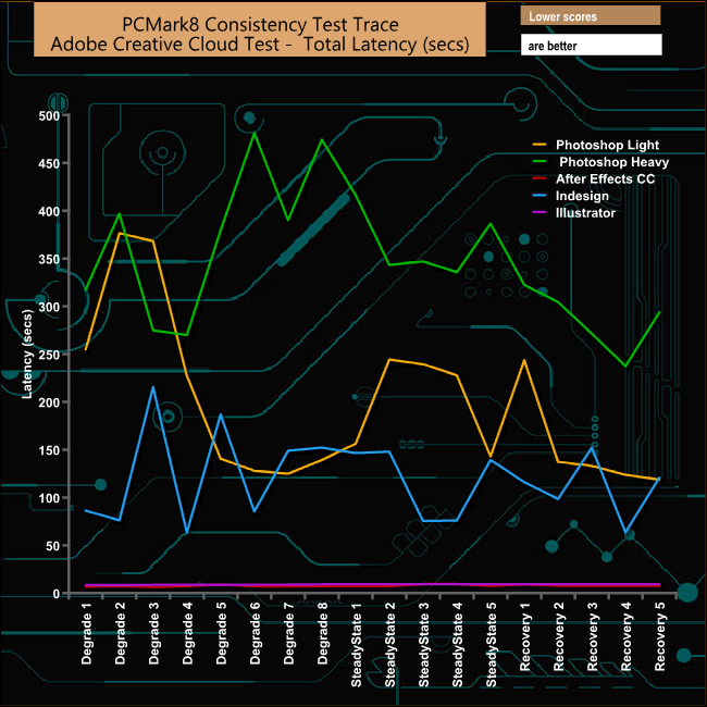 PCMark 8’s Consistency test provides a huge amount of performance data, so here we’ve looked a little closer at how the ADATA XPG SX950 240GB drive performs in each of the benchmarks test suites.
