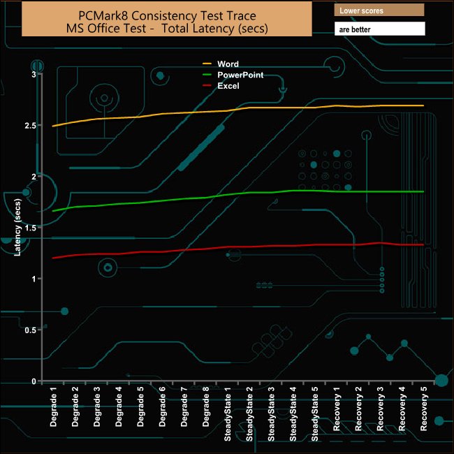 The drive had no problems dealing with the MS Office traces of PCMark8's Consistency test showing a consistent level of performance throughout the tests.