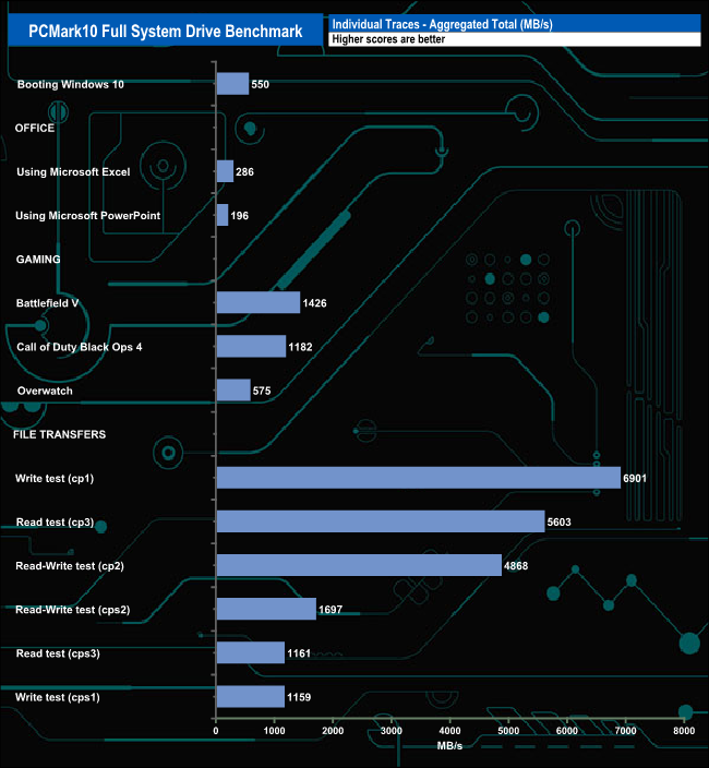 The PCMark 10 Full System Drive Benchmark uses a wide-ranging set of real-world traces from popular applications and common tasks to fully test the performance of the fastest modern drives. The benchmark is designed to measure performance of fast system drives using the SATA bus at the low end and devices connected via PCI Express at the high end.