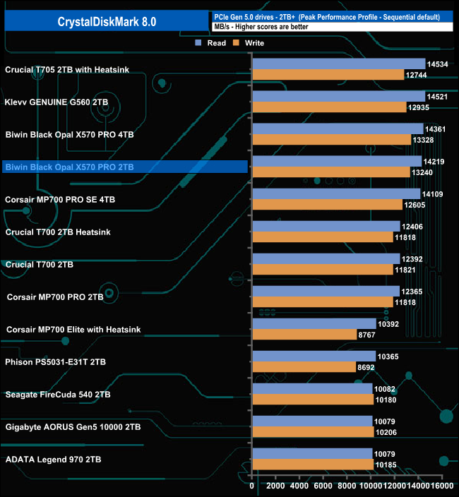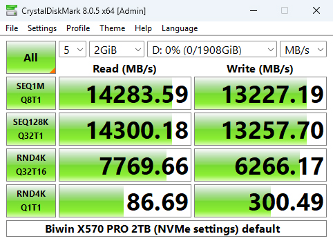 That 14,283MB/s read result places the 2TB X570 PRO in fourth place on the results chart just behind the 4TB version of the drive. It's read result is 88MB/s slower than its larger sibling while the 2TB write result is 181MB/s slower.