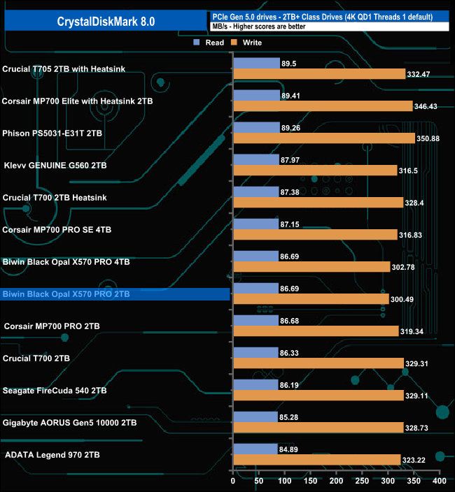 Biwin's 2TB Black Opal X570 PRO sits mid-table just below the 4TB model in the CrystalDiskMark 8 4K QD1 T1 test, with a read score of 86.69MB/s (identical to the larger version) and 300.49MB/s for writes.