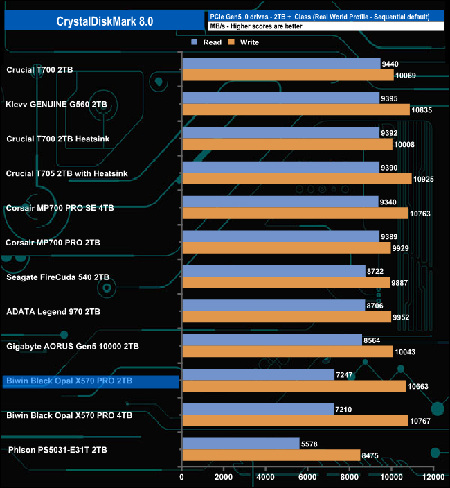 The 2TB X570 PRO sits very close to the bottom of the CrystalDiskMark 8 Real World result table with a read score of 7,247MB/s. However, its write score of 10.663MB/s is the fourth fastest we've seen for a Gen 5 SSD in this test.